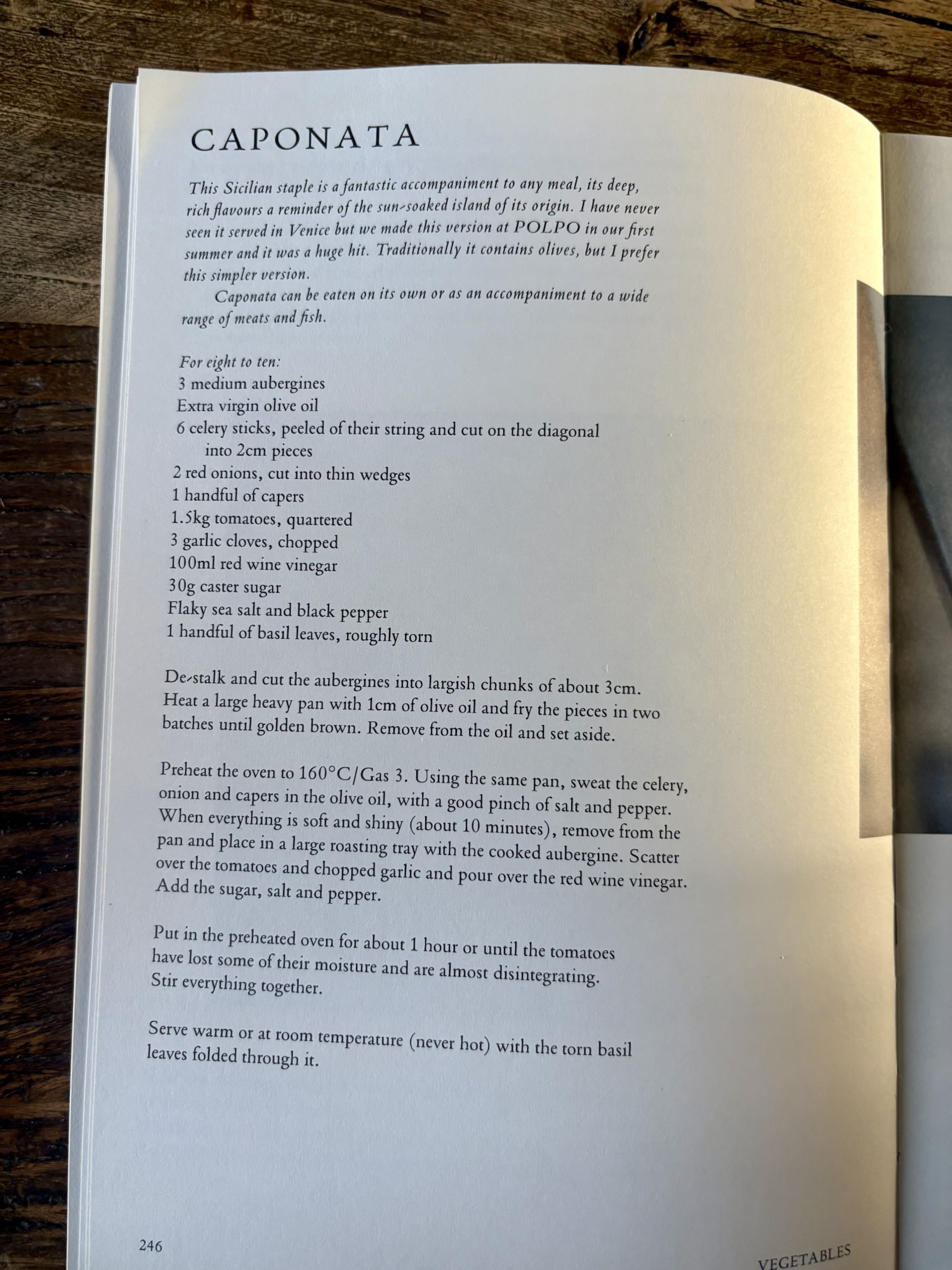 The standout this week: Lamb chump with caponata (page reference varies). Caponata — that sweet-sour Sicilian vegetable mix — is a dish that moves around the plate. Pair it with lamb, with fish, with cheese. At Mezzo on Waldorf Street, the first restaurant I worked in, we ran our own version with goat’s cheese. Clean plates, every time.